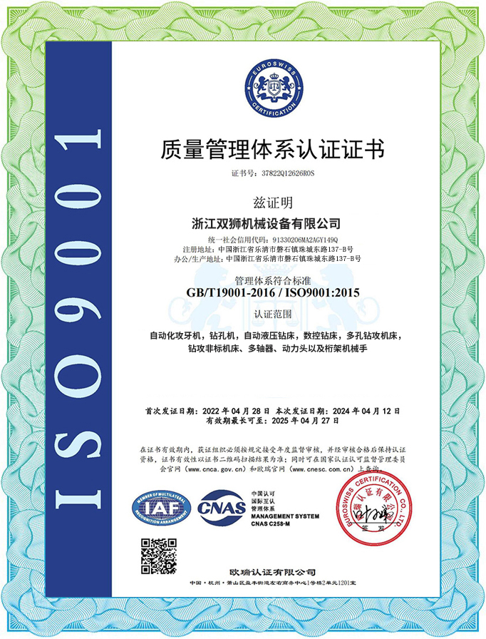 Zhejiang Shuangshi Machinery Equipment Co., Ltd. is located in Panshi Industrial Zone, Leqing City, Zhejiang Province, China, known as the capital of electrical appliances. It covers an area of about 20 acres and has standardized factory buildings of over 14000 square meters. It is adjacent to the Yongtaiwen Expressway to the west and Wenzhou Airport to the east, with convenient transportation. It is a technology innovation oriented enterprise, a national high-tech enterprise, and has been awarded the titles of Wenzhou Technology Innovation oriented Enterprise and Zhejiang Province Technology oriented Small and Medium sized Enterprise. The company has passed ISO9001 quality management system certification.